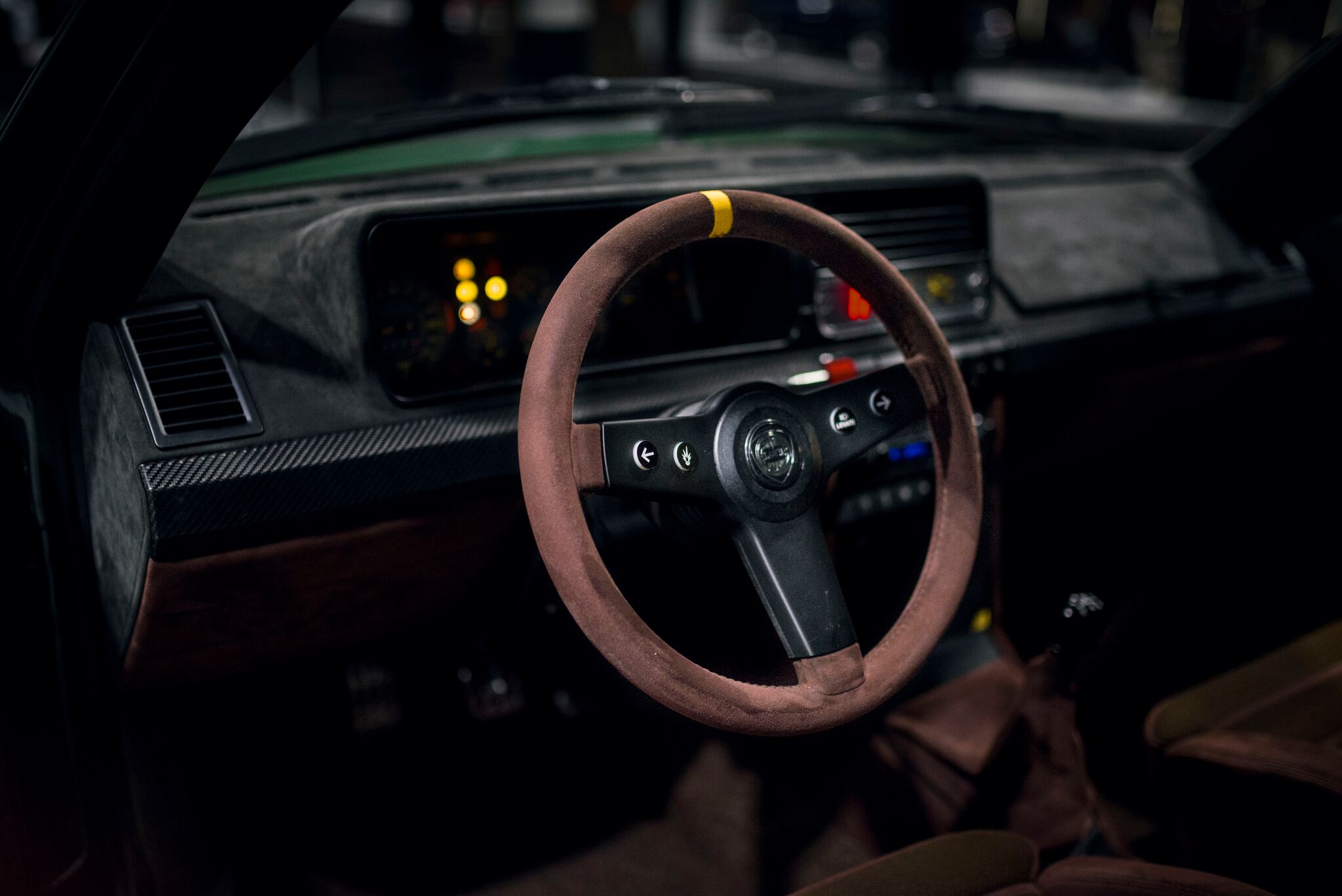Gli interni sono uno tsunami di qualità ed eleganza, con volante e sedili Recaro in Alcantara marrone, cielo in Alcantara antracite, strumentazione ridisegnata e devioluci integrati nelle razze del volante come da tradizione modenese.