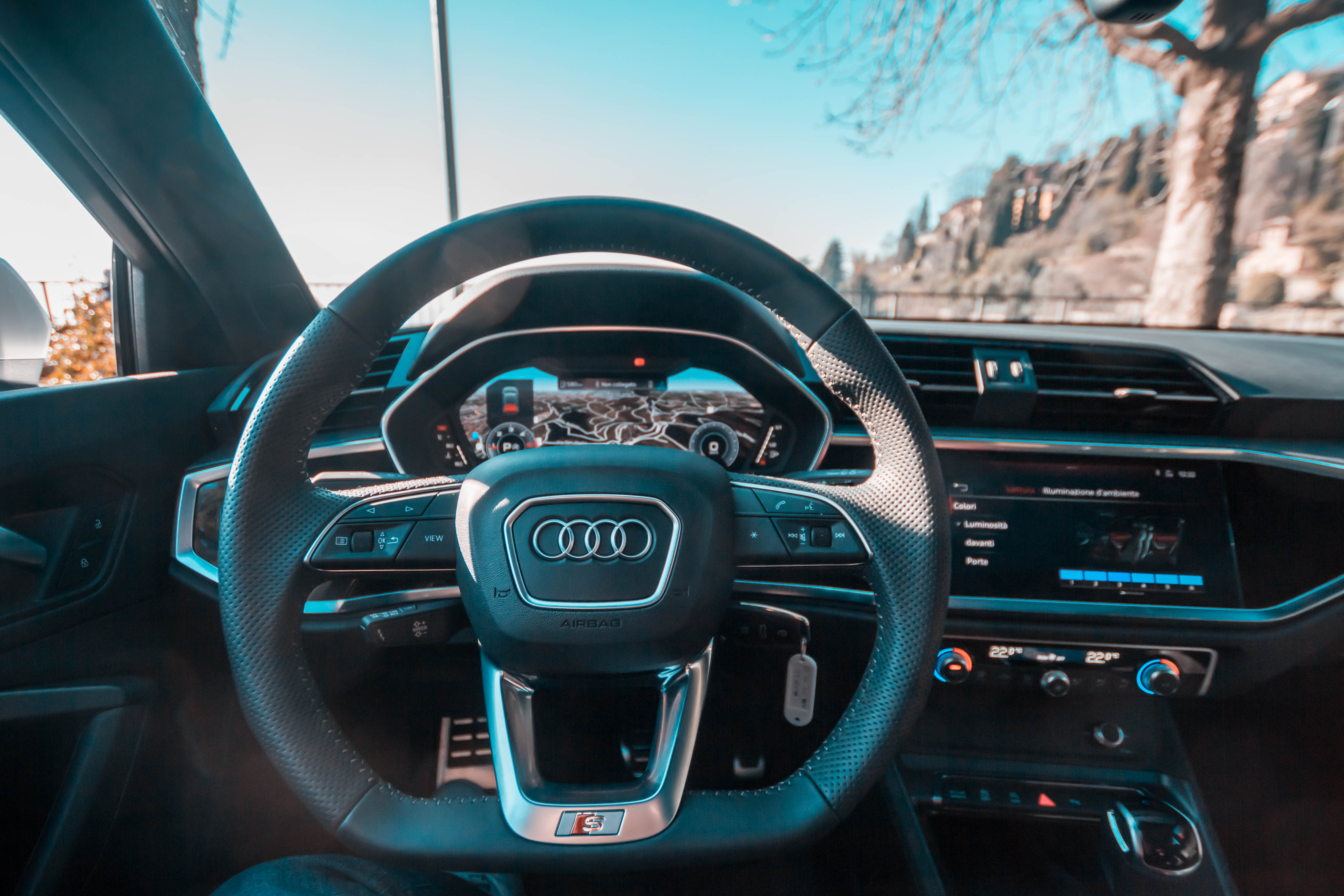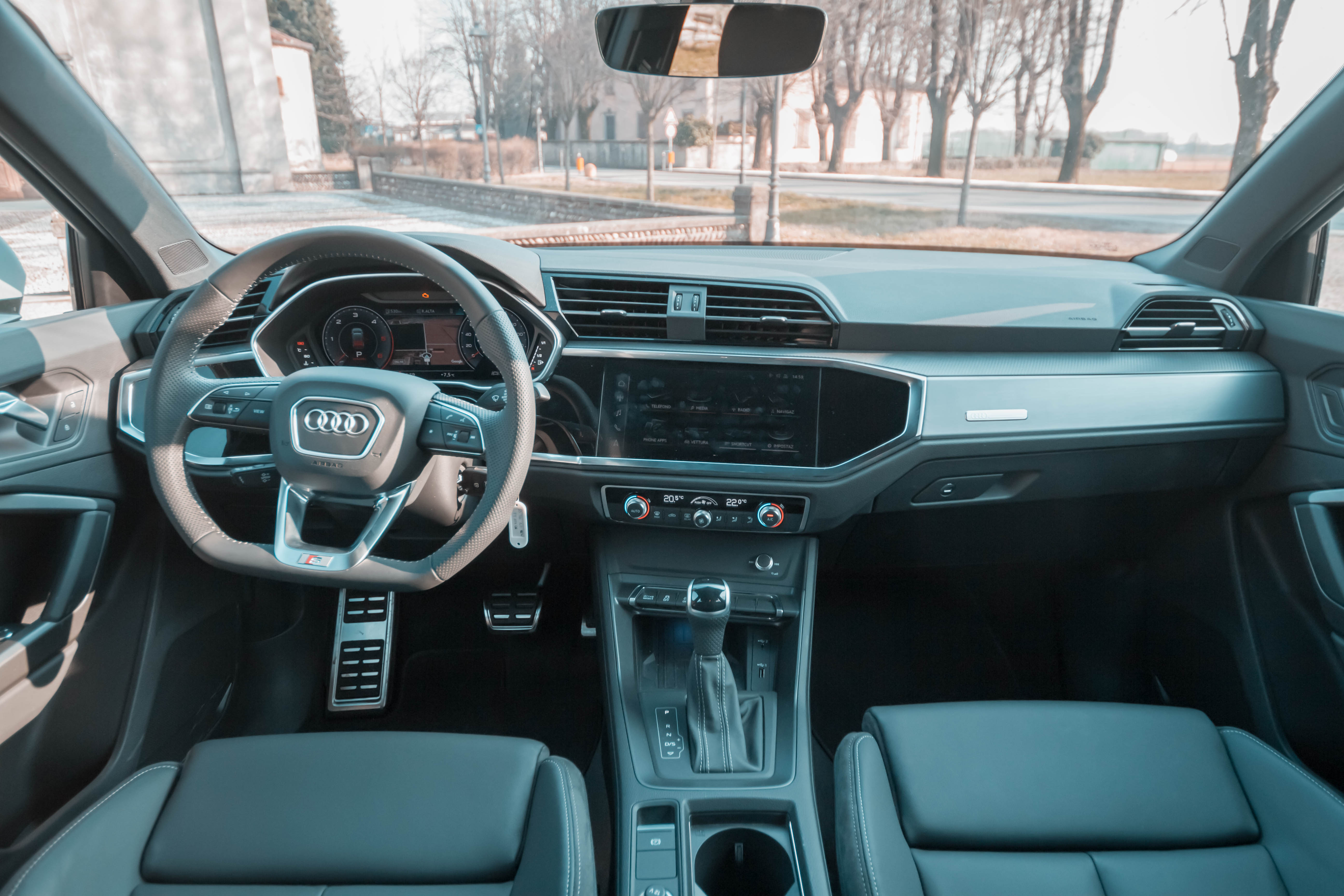 Inutile dire che l’attenzione è letteralmente rapita dall’Audi Virtual Cockpit posto dietro al volante, che è di serie per tutte le Q3 con schermo da 10,1 pollici, mentre si può avere la versione Plus da 12,3” con funzioni avanzate a 290 euro (optional da prendere assolutamente!). Dell’Audi Virtual Cockpit me ne innamoro ogni volta. C’è poco da dire. Facilissimo da usare, da personalizzare, con le informazioni giuste e con la possibilità di avere le mappe Google Earth 3D powered dalla NASA a tutto schermo.